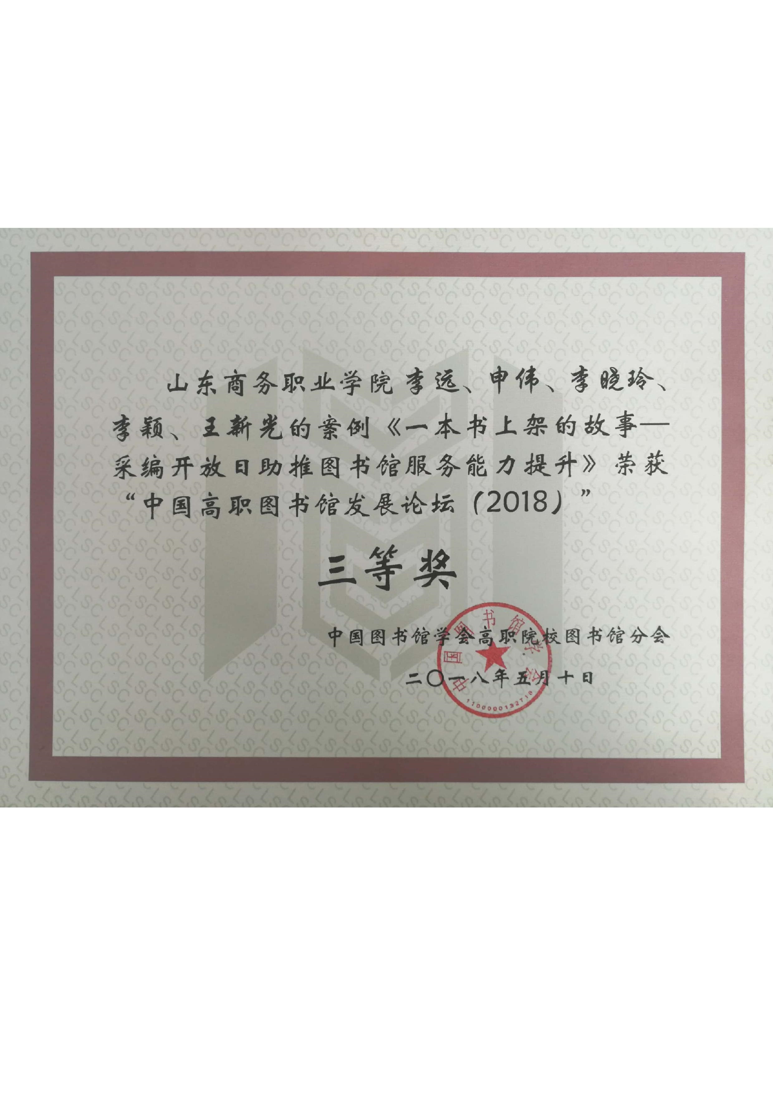 5月10日,2018年中国高职图书馆发展论坛在安徽省合肥市隆重召开,我馆提交的案例《一本书上架的故事---采编开放日助推图书馆服务能力提升》,经过专家评审,荣获三等奖,这是烟台地区高职图书馆在全国图书馆案例大赛中首次获奖。