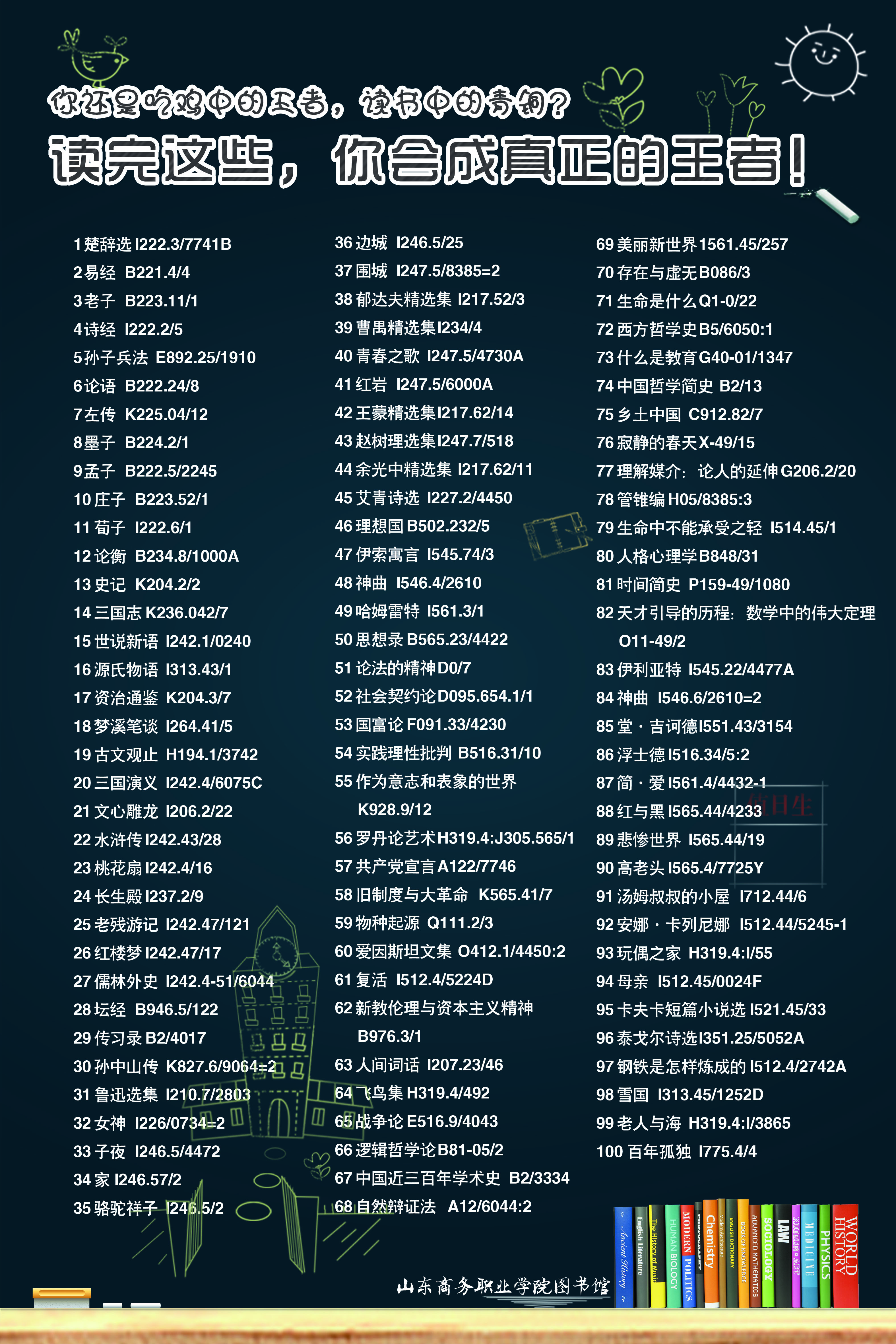 图书馆还为新生们精心挑选了大学生必读书目100册,并制成海报,在图书馆大厅、各个班级以及校园宣传栏等处张贴,让同学们感受到校园内浓郁的崇教尚学的氛围,引导新同学们度过一段充实而有意义的大学时光。
