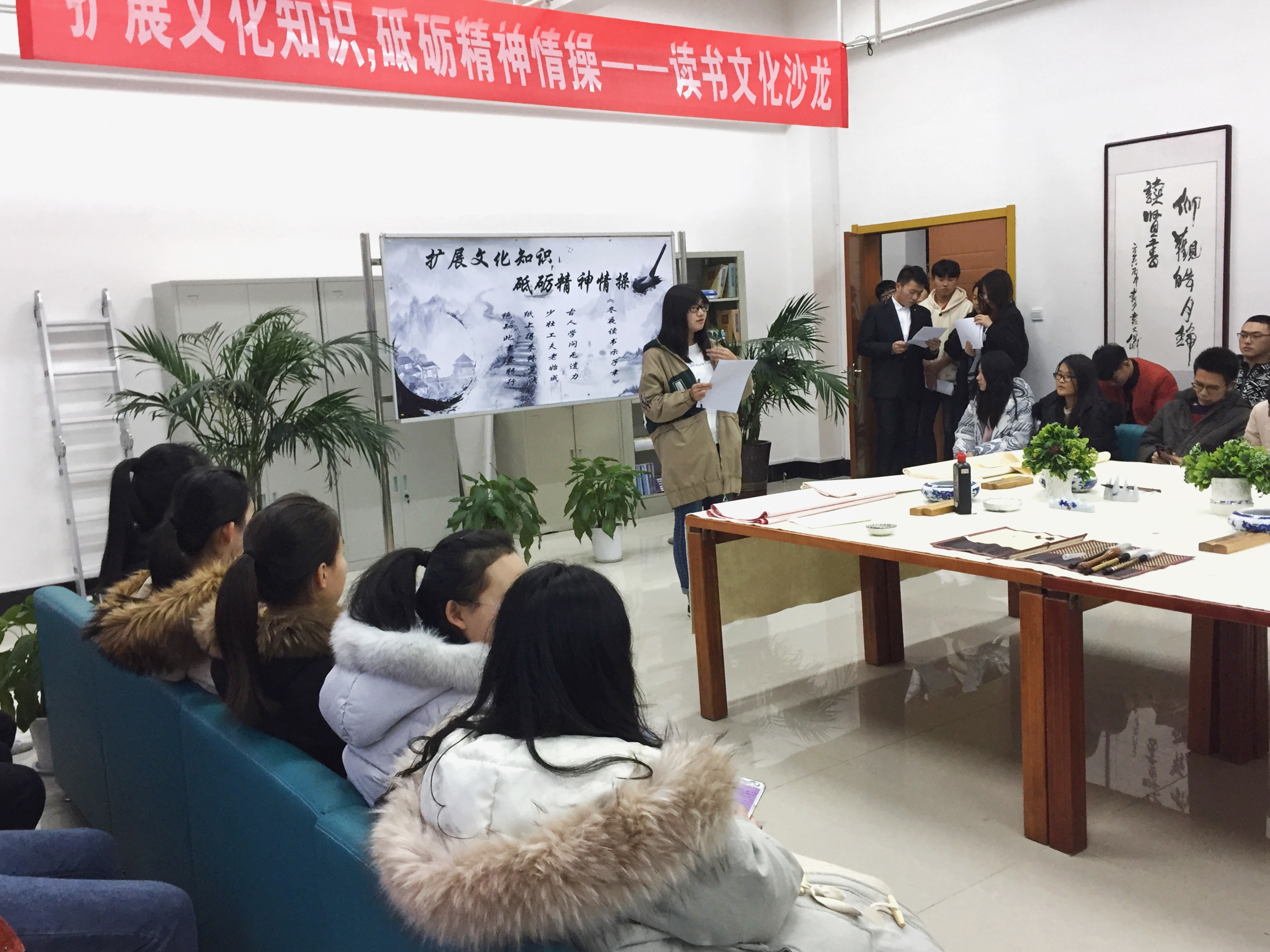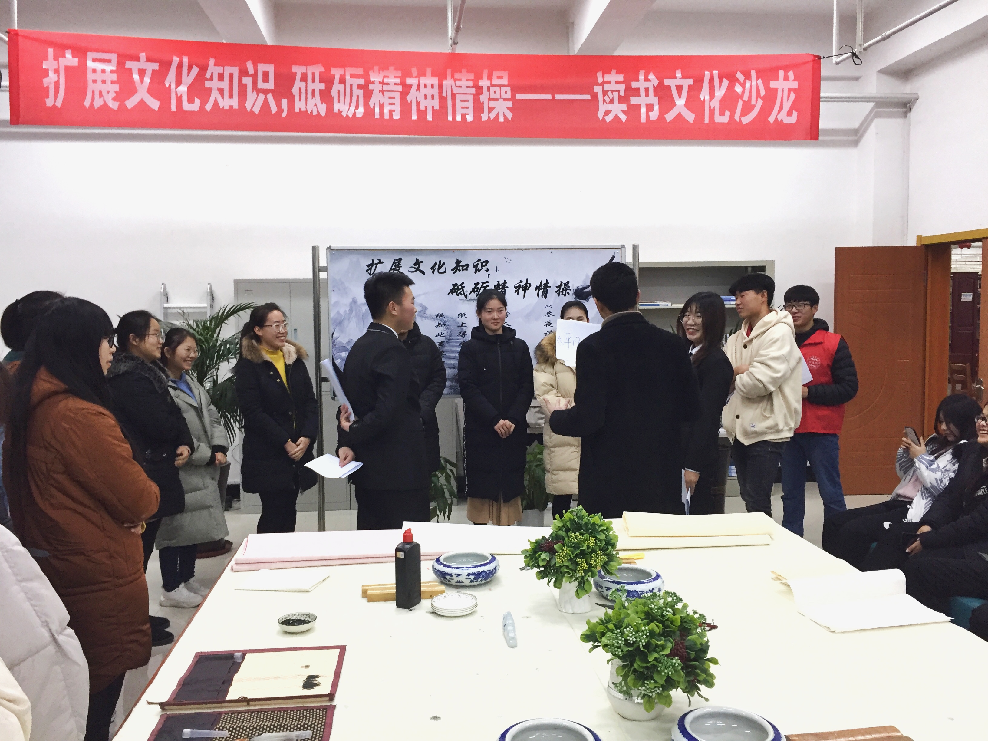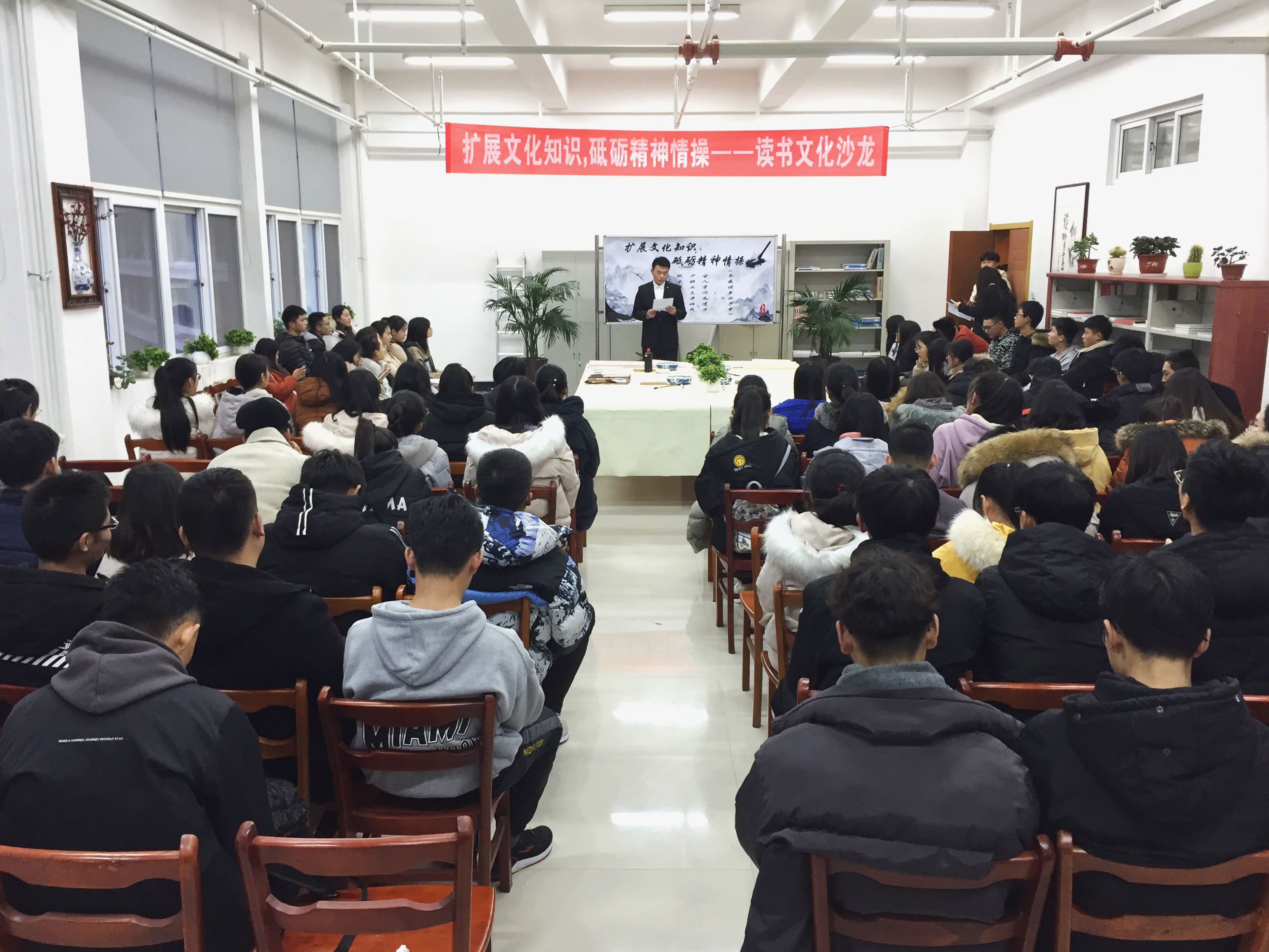12月25日,一场别开生面的读书文化沙龙在图书馆二楼书画室举行,来自图书馆读者服务部的三位老师,图书馆学生管理委员会、国学社、书画艺术社以及各系的120余名同学参加了这次活动。