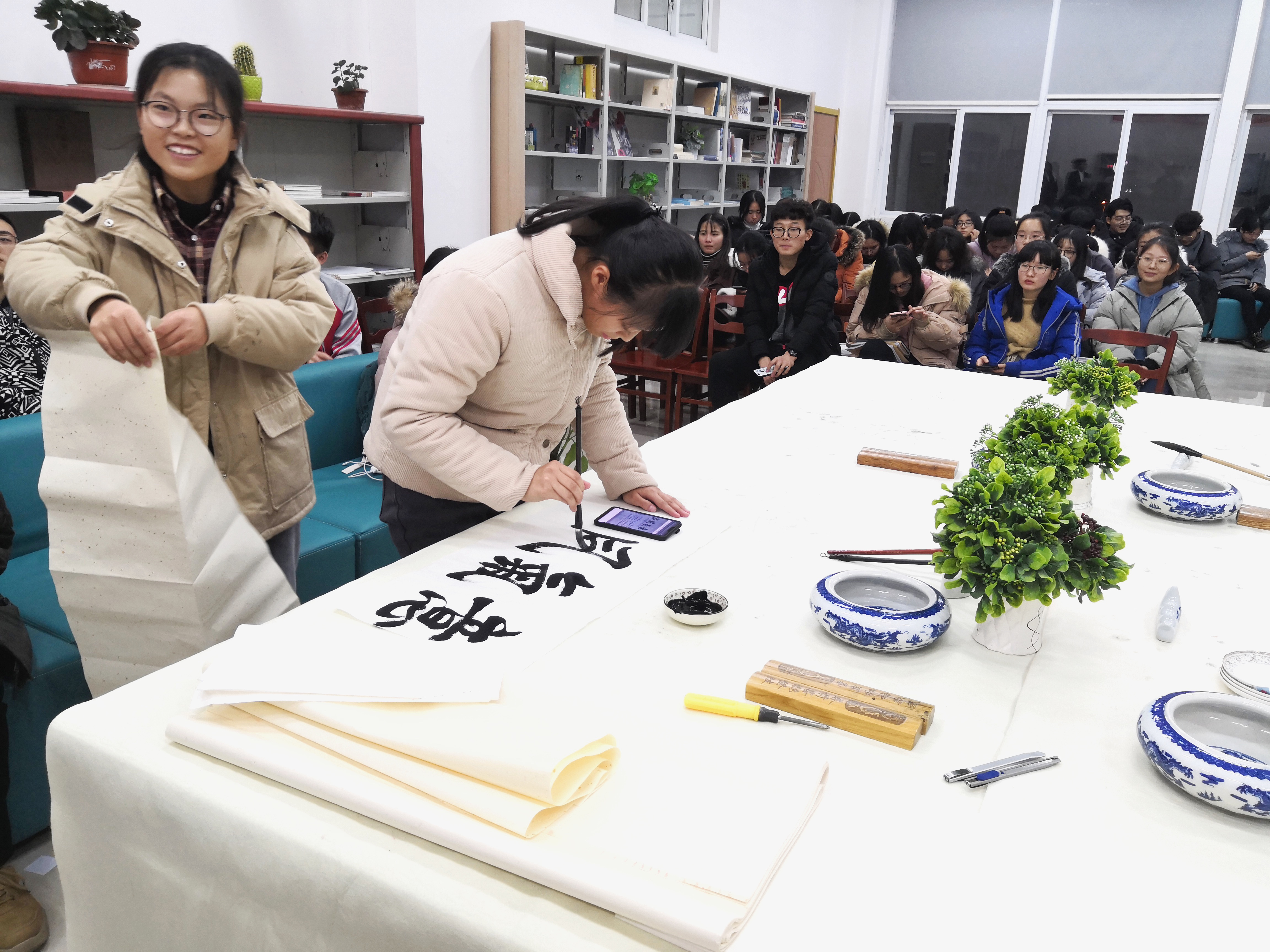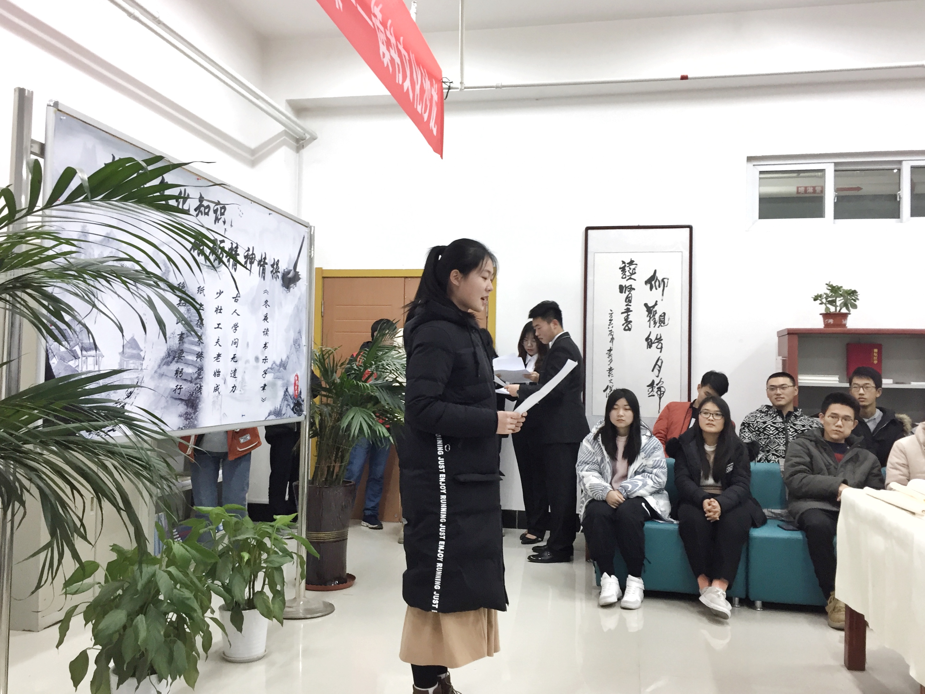 活动中,来自图书馆学管会的8位同学,先后做了读书心得交流,并推荐了若干好书;来自国学社的同学们分享了他们学习国学的收获,学习国学的意义和重要性,发言内容深刻,令人深思;书画艺术社的同学们现场讲解书法艺术的魅力和练就方法,同时现场挥毫泼墨,书写字画若干副。现场还有很多同学兴趣盎然,也试着执笔书写毛笔字,体验传统文化的魅力。活动现场,同学们积极交流与互动,气氛十分活跃。