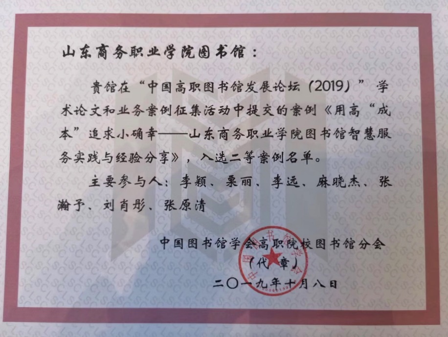 2019年10月17-18日,“中国高职图书馆发展论坛(2019)”在古都西安隆重召开,我校图书馆提交的案例《用高“成本”追求小确幸——山东商务职业学院图书馆智慧服务实践与经验分享》,经过专家评审,荣获二等奖。
