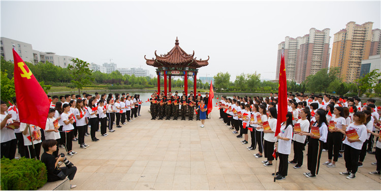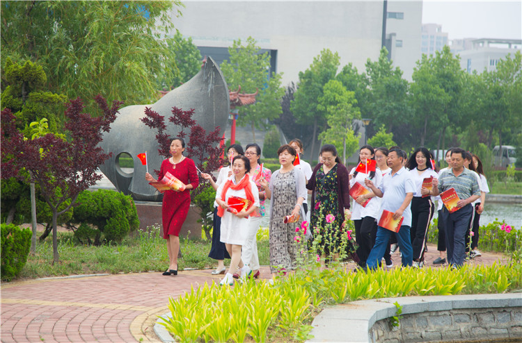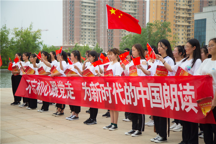 本站讯 不忘初心跟党走,为新时代的中国朗读。为庆祝新中国成立70周年,献礼中国共产党建党98周年,歌颂党在新时代的丰功伟绩,表达商务师生对祖国对党的无限热爱之情,6月28日下午3时,由我校学生处(团委)、宣传部、老干部处和图书馆联合组织的快闪活动在青年湖边精彩呈现,为党的98周岁生日献礼。烟台广播电台著名主持人、我校校外人生导师刘丽,学院副院长陶传蔚,退休教师代表,学生代表共200余人参加了本次活动。