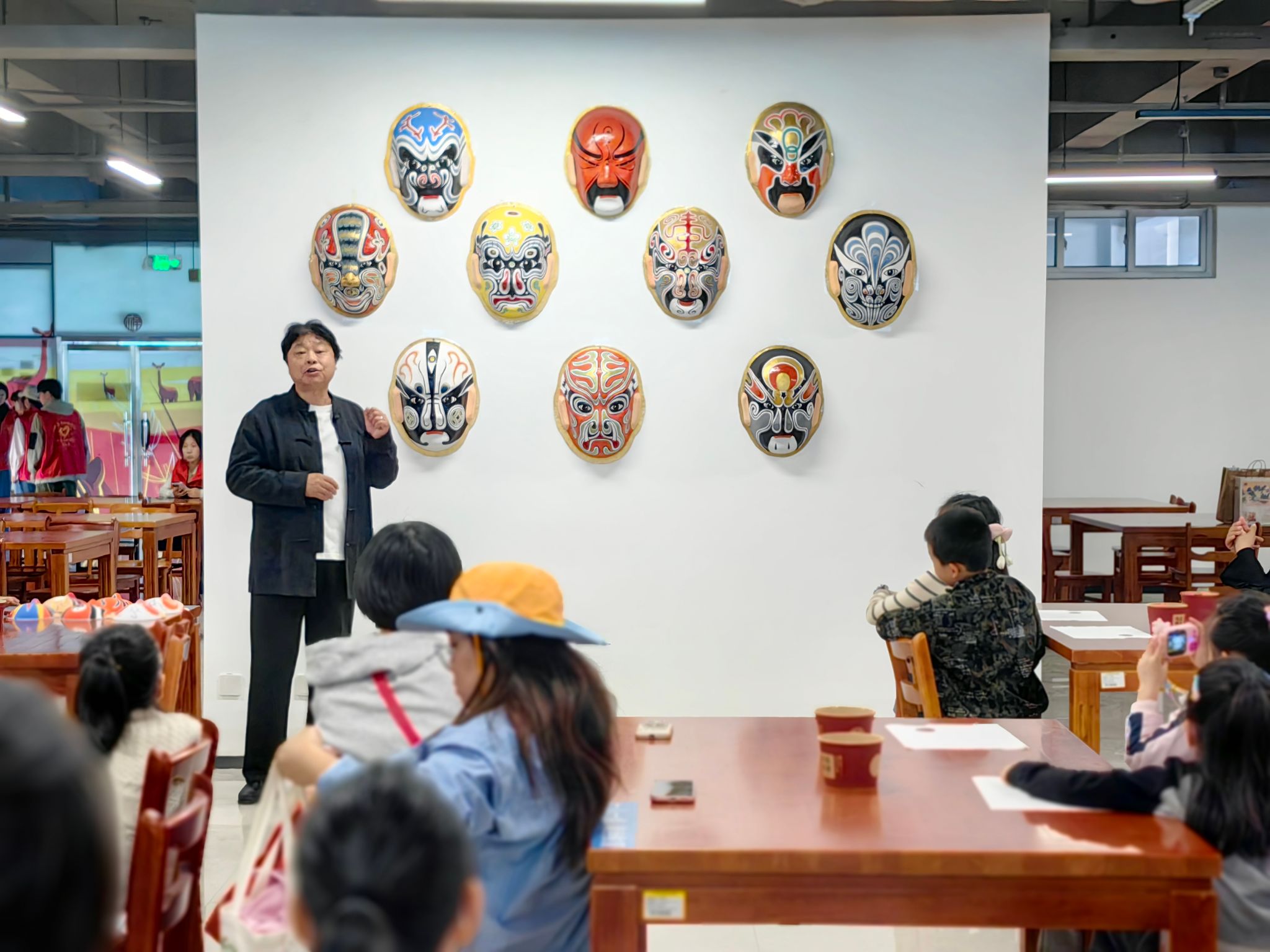 参观结束后,烟台市非物质文化遗产传承人陈玉山老师为青少年带来京剧脸谱文化专题讲座。讲座中,陈玉山老师围绕京剧的起源与发展、烟台与京剧的深厚渊源展开系统讲解,并重点解读了京剧脸谱的色彩体系及其对应的人物性格象征意义。“黑正粉老,黄狠灰奸,蓝勇绿暴,水白阴险,油白狂妄,金银神鬼灵”——一句生动口诀,清晰诠释了红脸忠义、蓝脸勇猛、黑脸刚正、金脸神异的文化内涵。互动式的讲解方式,让青少年在问答交流中,对脸谱背后的文化意蕴与艺术特征形成了更为深刻、直观的理解。