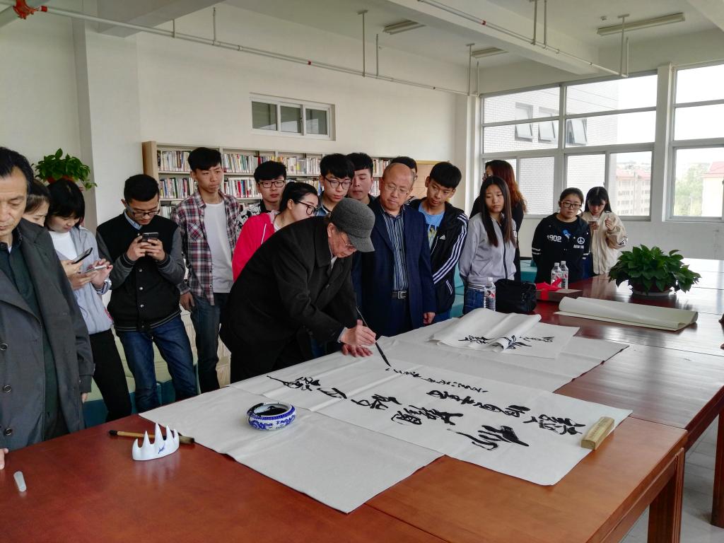 本次袁大仪院长共捐献画册近三百册,图书馆专门成立了袁大仪院长画展藏室,用以收藏其珍贵画册。在展藏室,看到自己数十载的作品能够被我校图书馆收藏,能够让更多的学子及书画爱好者驻足观摩,袁院长兴致盎然并欣然提笔:“仰观皓月,静读贤书”,表示今后将陆续捐赠本人的相关作品,同行参观的其他艺术家代表也纷纷表达了捐赠意愿,为正在举办的以“书香之风采丹墨之雅韵”为主题的大学生读书文化节增添了浓墨重彩的一笔。陶院长表示将以此次捐赠活动为契机,进一步加强与社会各界的文化艺术交流,并争取建立一个“本地艺术家文库”,突出地方特色、突出商院特色,切实保存、利用好珍贵的艺术文化资源,推动校园文化建设再上新台阶。